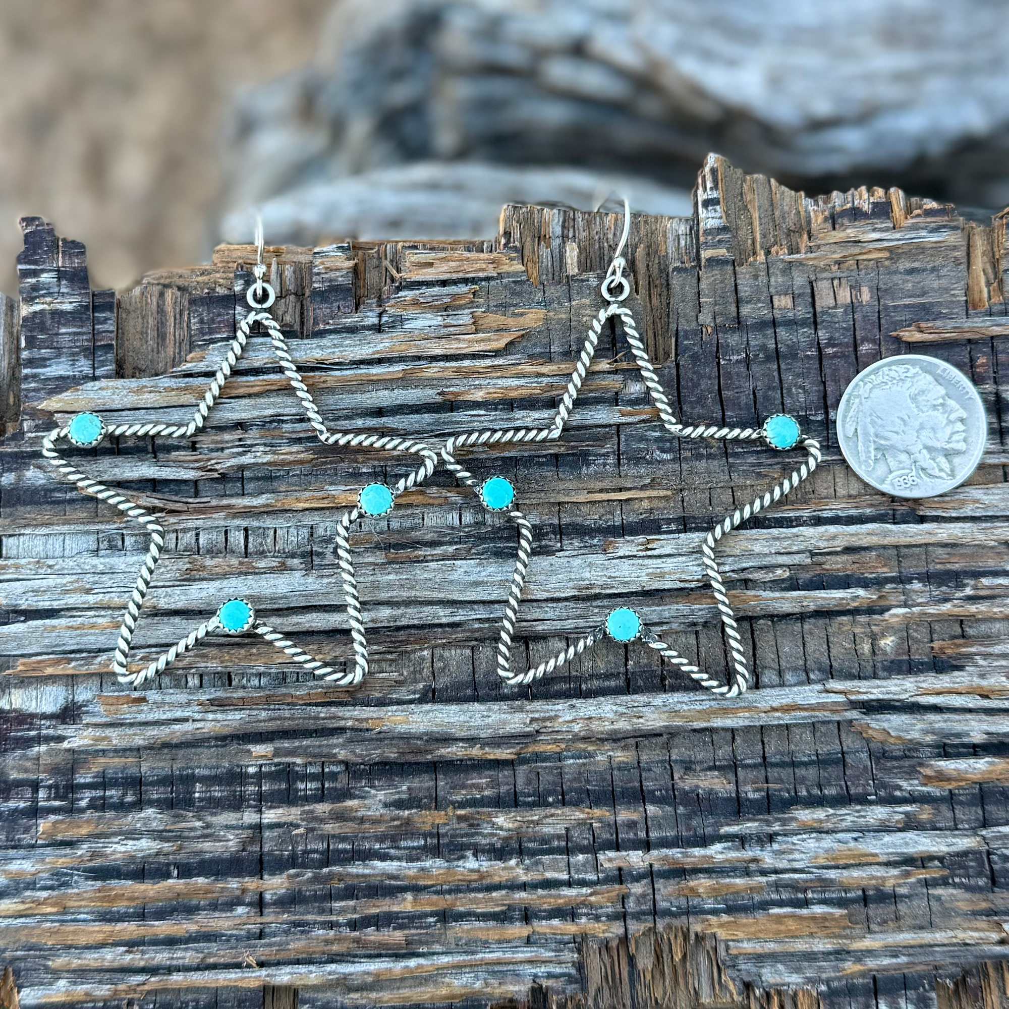 Each star is accented with 5mm turquoise stones, thoughtfully placed to highlight the shape and bring a vibrant pop of color against the bright silver. The natural turquoise adds a timeless, earthy touch that pairs beautifully with both casual and dressier looks.