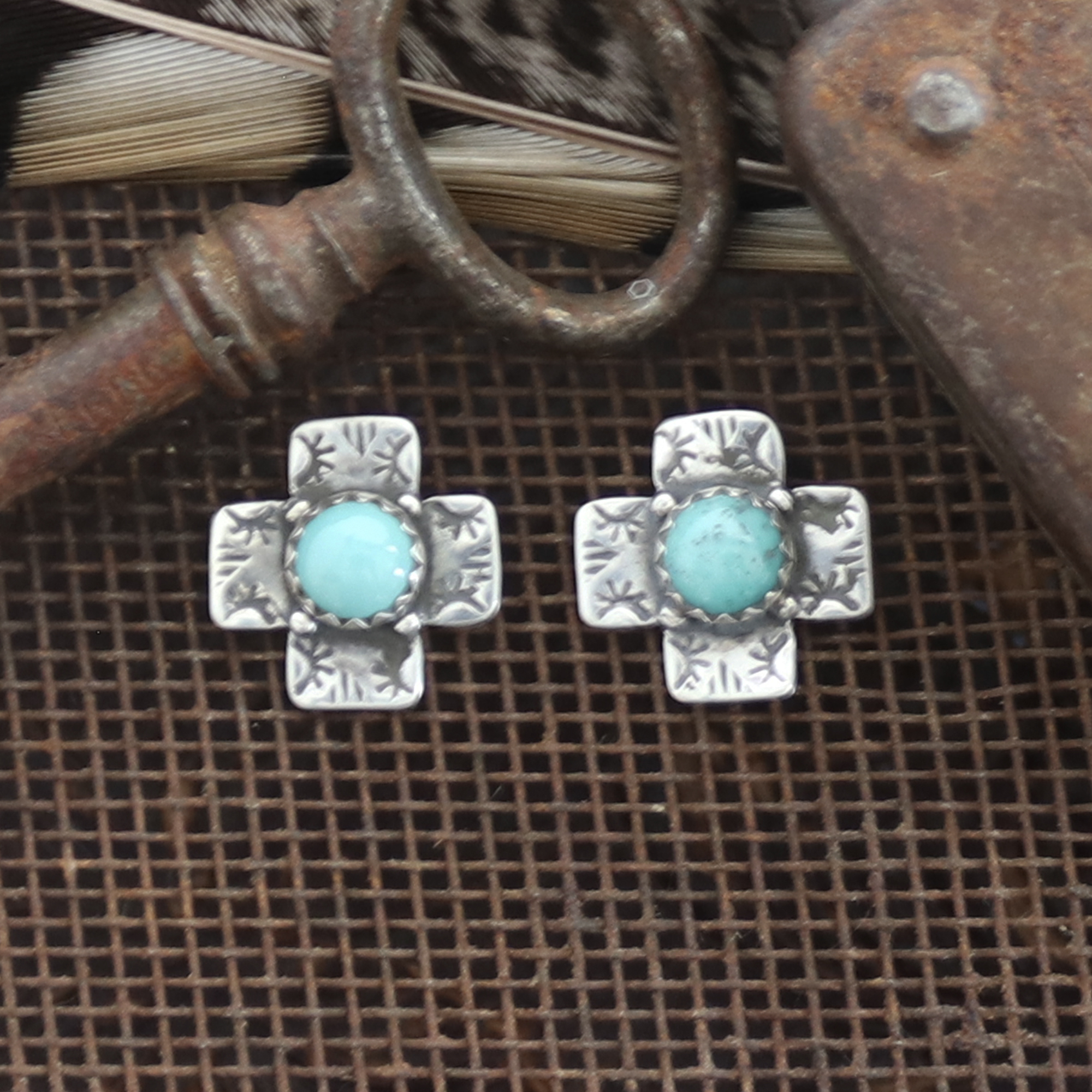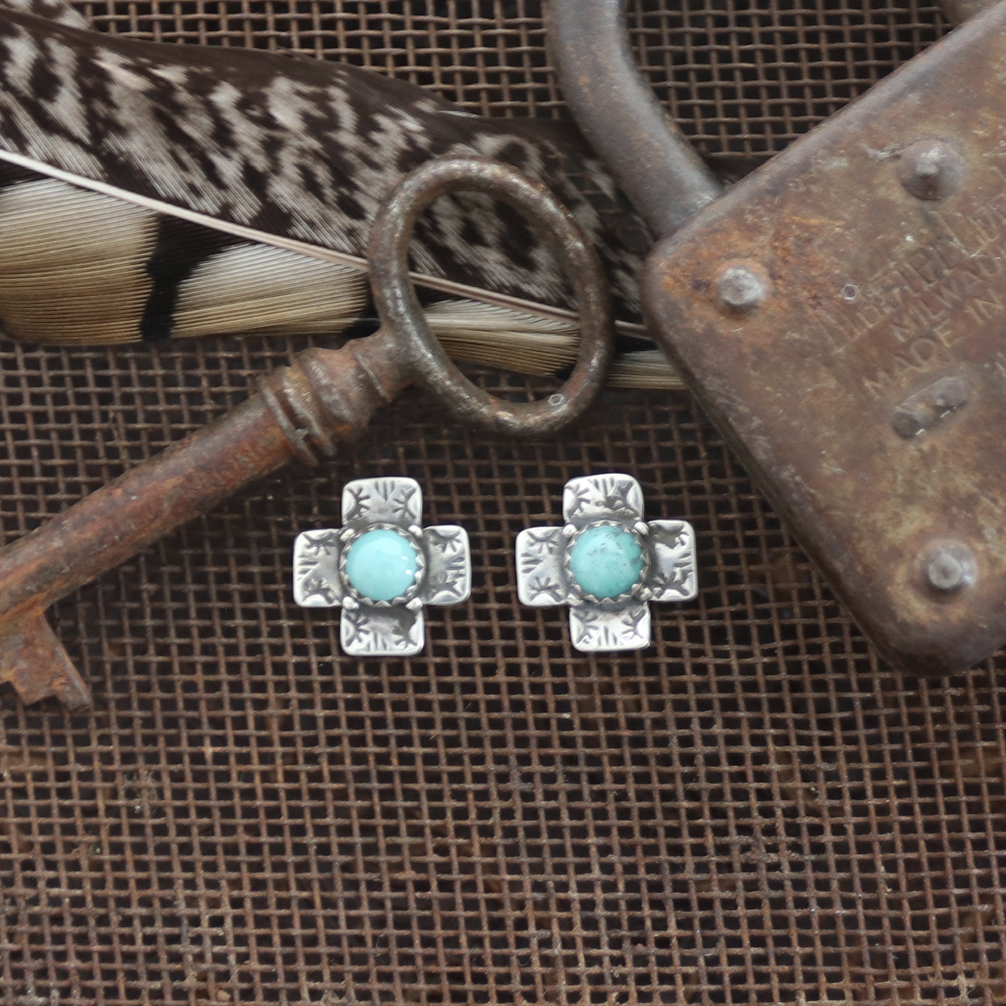 These sterling silver small equilateral cross post earrings, feature a genuine 6mm turquoise dot at their center, adding a touch of natural beauty and grace. Each piece is expertly crafted from high-quality, solid sterling silver, ensuring durability and timeless beauty making it a perfect accessory for any occasion. These earrings measure 1/2" long by 1/2".