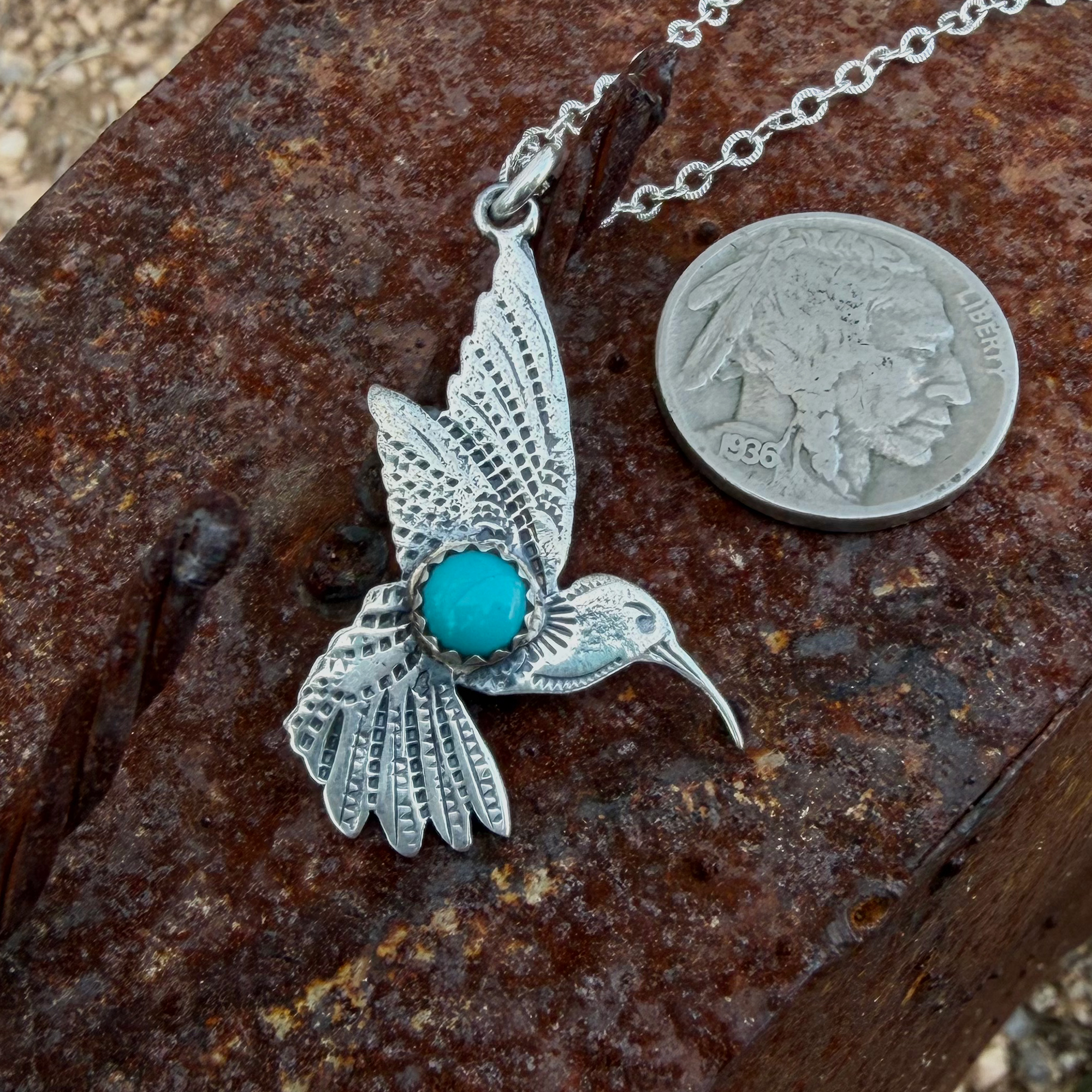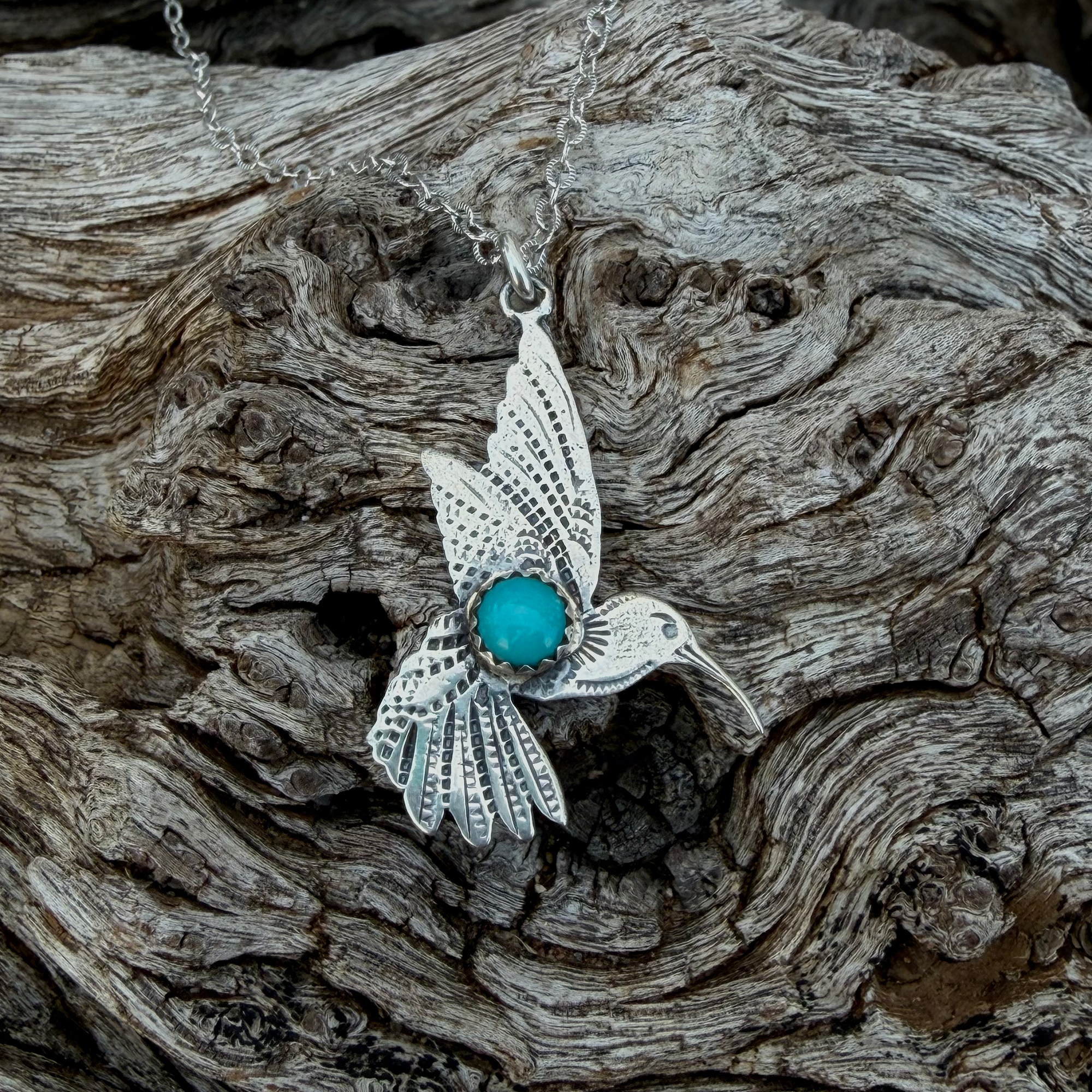 The Hummingbird Pendant is a beautifully detailed sterling silver piece that captures the grace and energy of this beloved desert bird. Expertly shaped in mid-flight, the hummingbird’s wings are spread wide, showcasing intricate hand-stamped patterns that add depth, texture, and movement to the design.